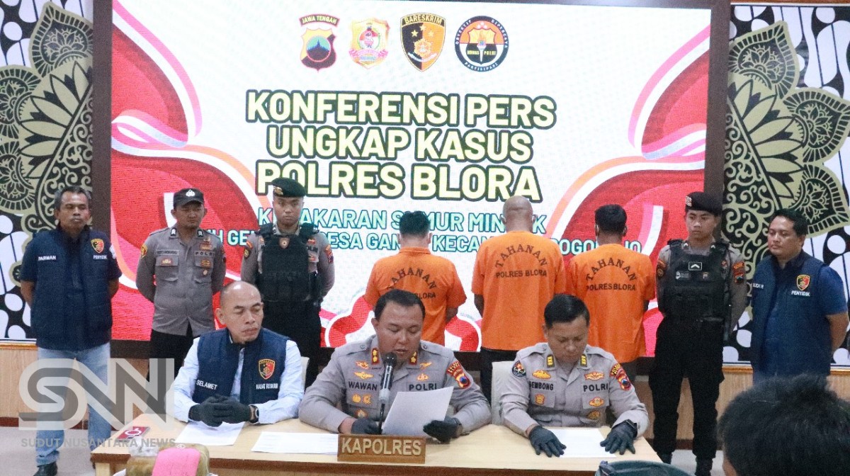 Blora, sudutnusantaranews.com – Penyidik Polres Blora resmi menetapkan tiga orang sebagai tersangka terkait kejadian ledakan dan kebakaran sumur minyak ilegal yang melepaskan empat orang di Desa Gandu, Kecamatan Bogorejo, Kabupaten Blora. Tersangka ketiga itu, yaitu SPR (46), pemilik lahan yang menjadi pemrakarsa pengeboran; ST (42), calon investor; serta HRT alias GD (45), pelaksana pengeboran.