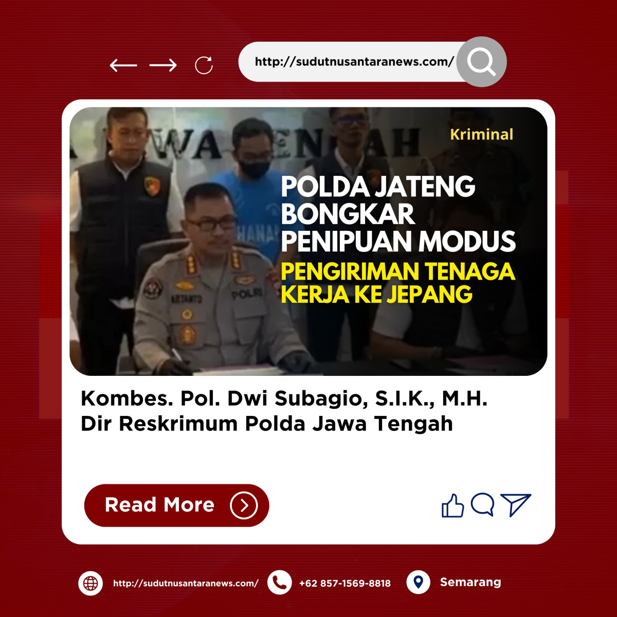 Semarang, sudutnusantaranews.com – Seorang direktur penyalur tenaga kerja berinisial S ditangkap tim Direktorat Reserse Kriminal Umum Polda Jawa Tengah (Jateng). S diduga melakukan tindak pidana perdagangan orang (TPPO) dan penipuan dalam proses pengiriman tenaga kerja ke luar negeri.