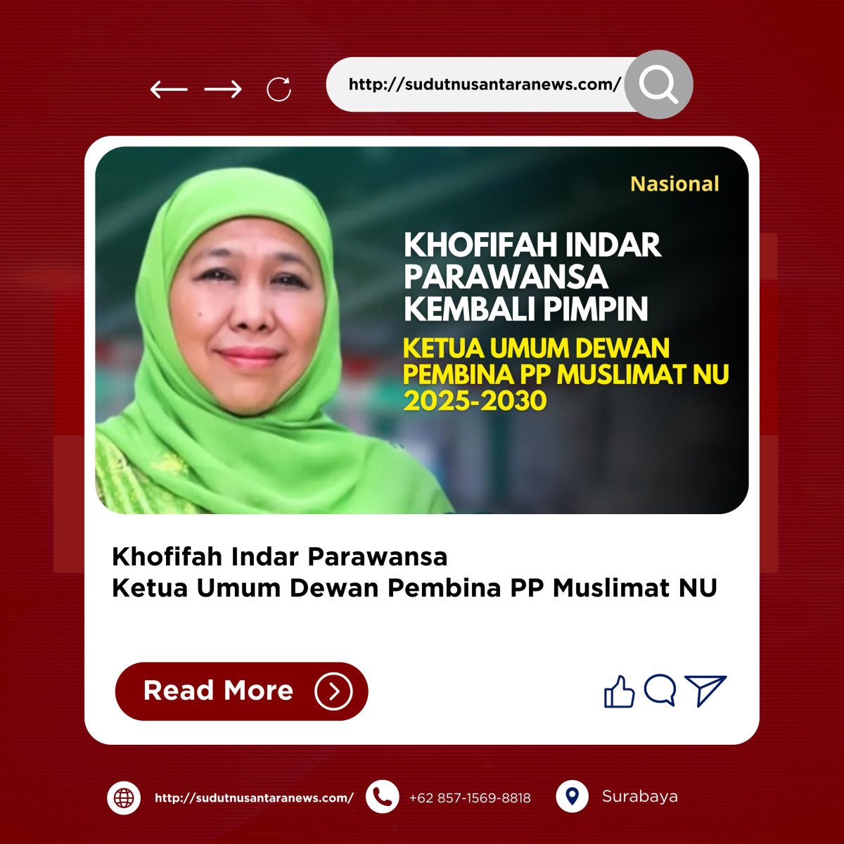 Surabaya, Sudutnusantaranews.com – Khofifah Indar Parawansa melanjutkan kepemimpinan di Muslimat Nahdlatul Ulama (NU) untuk periode yang kelima, yaitu tahun 2025 – 2030.