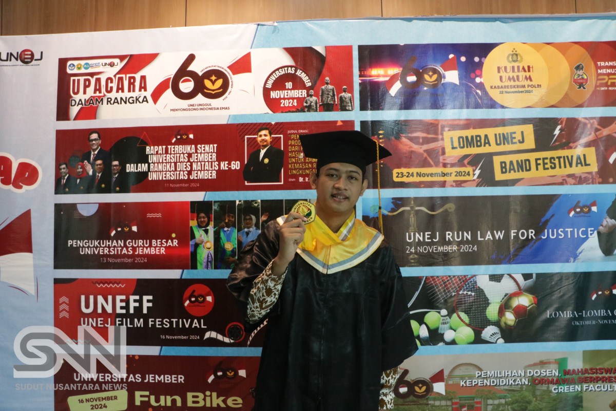 Jember, sudutnusantaranews.com – Universitas Jember kembali menyelenggarakan Wisuda Periode IX Tahun Akademik 2024/2025, Sabtu (17/5/2025), di Gedung Auditorium Kampus Tegalboto Universitas Jember. Sebanyak 800 lulusan dari 16 fakultas dan program pascasarjana secara resmi dikukuhkan oleh Rektor UNEJ, Dr. Ir. Iwan Taruna, M.Eng., IPM., ASEAN Eng.
