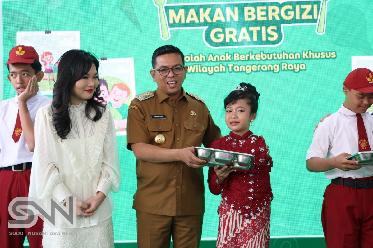 Kota Tangerang, sudutnusantaranews.com – Gubernur Banten Andra Soni meninjau program Makan Bergizi Gratis (MBG) kerjasama Yayasan Pelita Bangsa dengan Grab-OVO di Sekolah Khusus (SKh) 1 Kota Tangerang Selatan, Senin (28/4/2025). Dalam kesempatan tersebut Andra Soni mengapresiasi kepada Yayasan Inklusi Pelita Bangsa bersama dengan Grab-OVO yang turut serta melaksanakan uji coba program Makan Bergizi Gratis (MBG) bagi siswa-siswi Sekolah Kebutuhan Khusus (SKh) di wilayah Tangerang Raya. Uji coba tersebut akan menyasar pada 11 SKh.