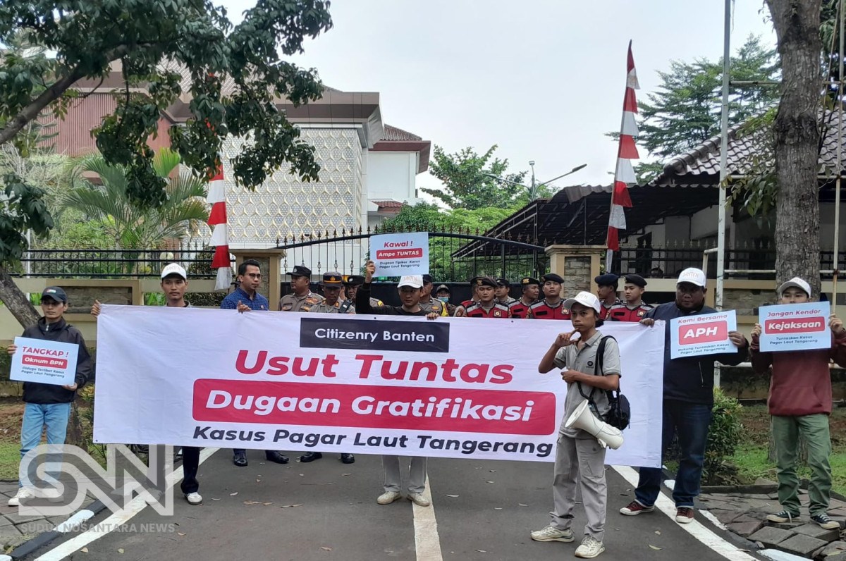 Puluhan peserta aksi selain membentangkan spanduk bertuliskan ‘Usut Tuntas Dugaan Gratifikasi Kasus Pagar Laut Tangerang’ juga sejumlah alat peraga bertuliskan ‘Tangkap Oknum ATR/BPN yang terlibat dalam Kasus Pagar Laut’, ‘Jangan Kendor Kejaksaan Usut Ampe Tuntas Kasus Pagar Laut’, ‘Kami Bersama APH, Dukung Kasus Pagar Laut Tangerang.