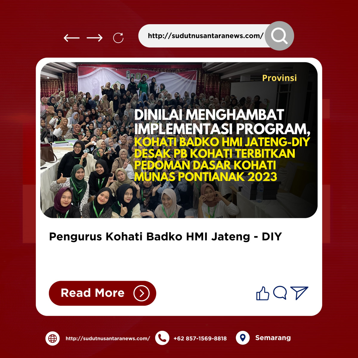 Semarang, sudutnusantaranews.com – Pengurus Korps HMI-Wati (KOHATI) Badan Koordinasi (BADKO) Himpunan Mahasiswa Islam (HMI) Jawa Tengah dan Daerah Istimewa Yogyakarta (Jateng-DIY) mendesak Pengurus Besar (PB) Kohati untuk segera menerbitkan Pedoman Dasar Kohati (PDK) hasil Musyawarah Nasional (Munas) Pontianak Tahun 2023. Mereka menilai bahwa keterlambatan ini berdampak pada keberlangsungan organisasi dan efektivitas program kerja di tingkat regional.