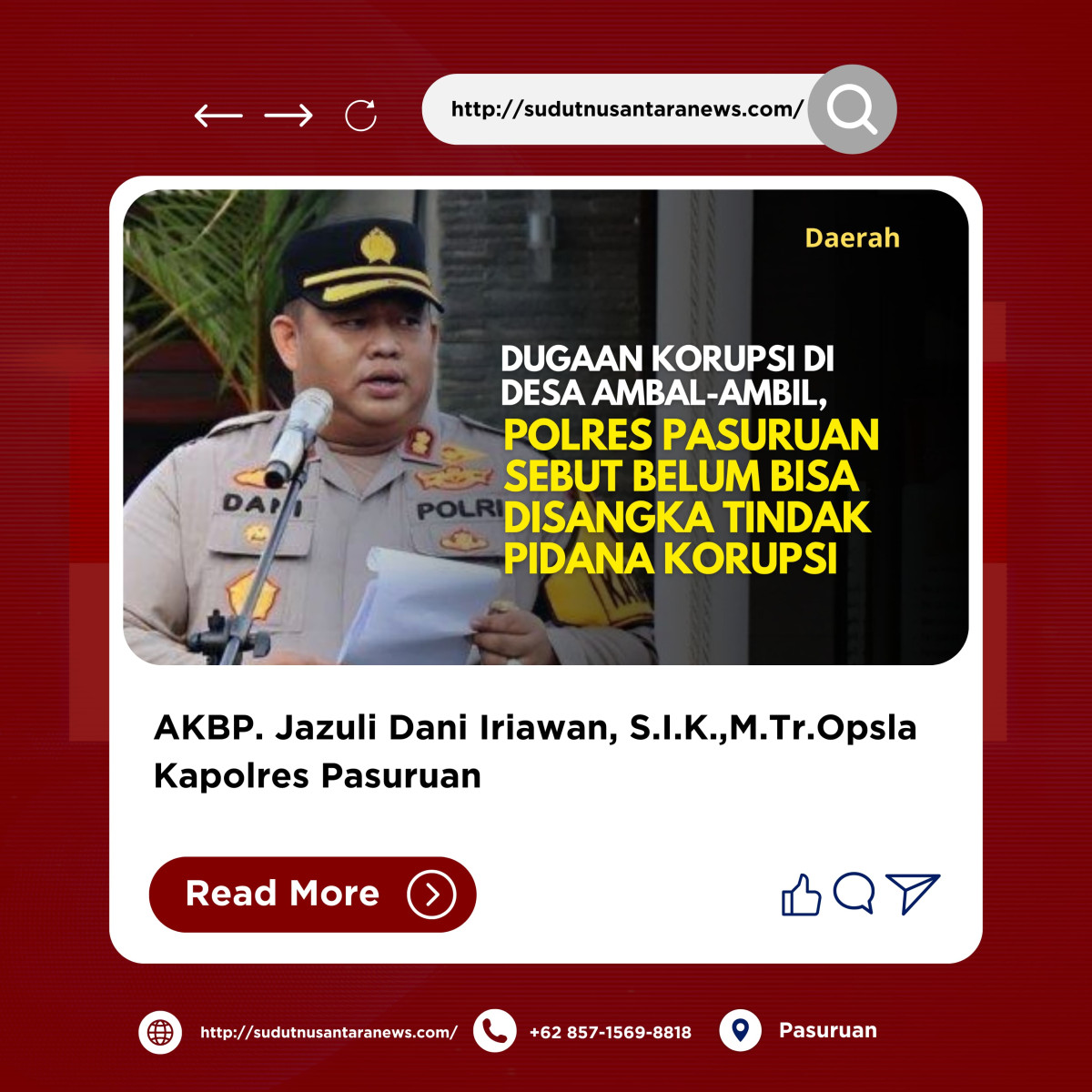 Pasuruan, sudutnusantaranews.com – Polres Pasuruan mendapat arahan dari Polda Jawa Timur terkait perkara di Desa Ambal-ambil Pasuruan. Berdasarkan petunjuk tersebut, pihak yang disangkakan dalam kasus ini belum dapat di tetapkan sebagai tersangka melakukan tindak pidana korupsi sesuai pasal yang awalnya ditetapkan.