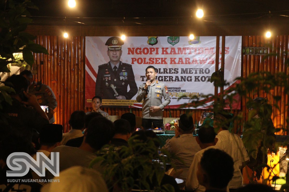 Tangerang, sudutnusantaranews.com – Dalam upaya menjaga keamanan dan ketertiban masyarakat (Kamtibmas), Polres Metro Tangerang Kota menggelar kegiatan bertajuk Ngopi Kamtibmas bersama tokoh agama (Toga), tokoh masyarakat (Tomas), serta warga Kelurahan Pabuaran Tumpeng, Kecamatan Karawaci, Kota Tangerang, pada Kamis malam (31/7/2025) pukul 20.00 WIB.