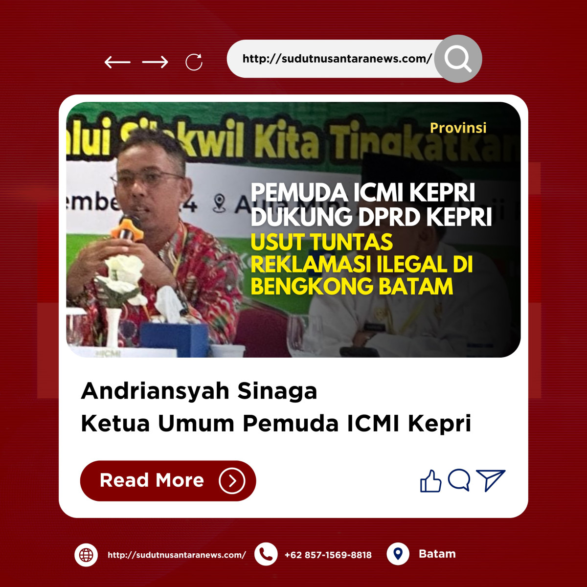 Batam, sudutnusantaranews.com – Pemuda ICMI Kepulauan Riau (Kepri) menyatakan dukungan penuh terhadap langkah DPRD Kepri dalam mengusut tuntas kasus reklamasi ilegal di wilayah Bengkong, Kota Batam. Mereka juga mendesak aparat penegak hukum untuk menangkap pengusaha lokal yang terlibat dalam aktivitas tersebut.