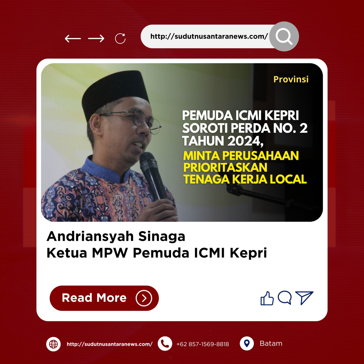 Batam, Sudutnusantaranews.com – Pemuda Ikatan Cendekiawan Muslim Indonesia (ICMI) Kepulauan Riau (Kepri) menyoroti implementasi Peraturan Daerah (Perda) Kota Batam Nomor 2 Tahun 2024 tentang Penempatan Tenaga Kerja Local. Perda ini mengamanatkan agar perusahaan di Batam lebih memprioritaskan pekerja local dibanding tenaga kerja dari luar daerah.