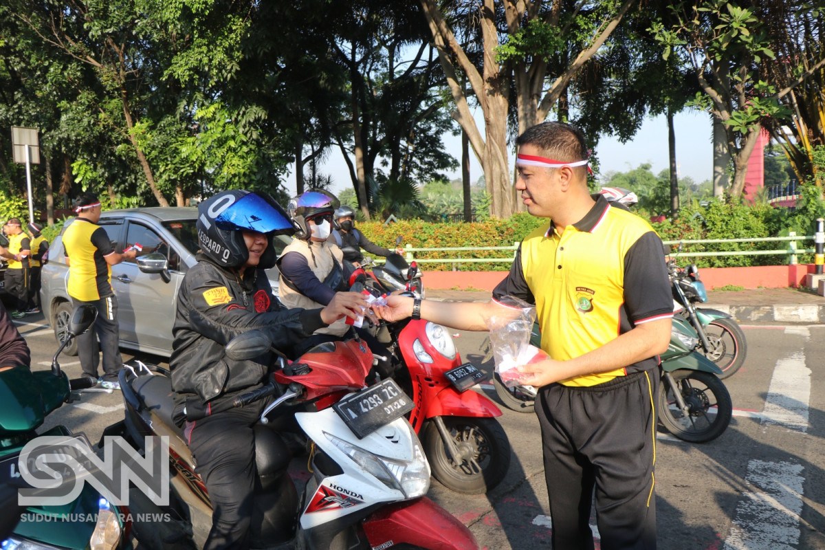 Kapolres Metro Tangerang Kota, Kombes Pol Dr. Raden Muhammad Jauhari, S.H., S.I.K., M.Si. saat membagikan bendera merah putih ke pengendara motor. (Dok. Istimewa)