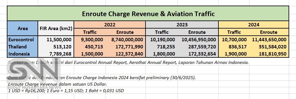 Data dalam gambar di atas, menunjukkan bahwa pendapatan en-route charge Thailand tahun 2024 adalah 1,93 kali lebih besar dari Indonesia. Meskipun secara luas ruang udara yang dikelola (FIR area, flight information region area) Indonesia 15 kali lebih luas dari Thailand; dan secara lalu lintas pesawat (total penerbangan rute domestik, internasional, dan overflying), Indonesia lebih banyak 2,27 kali dari Thailand.