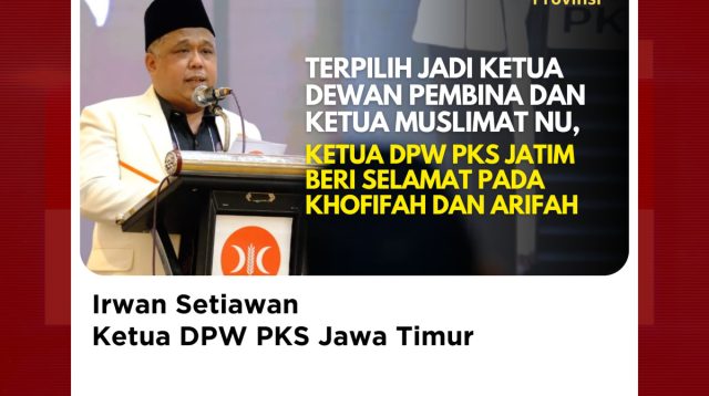 Surabaya, Sudutnusantaranews.com — Ketua DPW PKS Jawa Timur, Irwan Setiawan, menyampaikan ucapan selamat atas terpilihnya […]